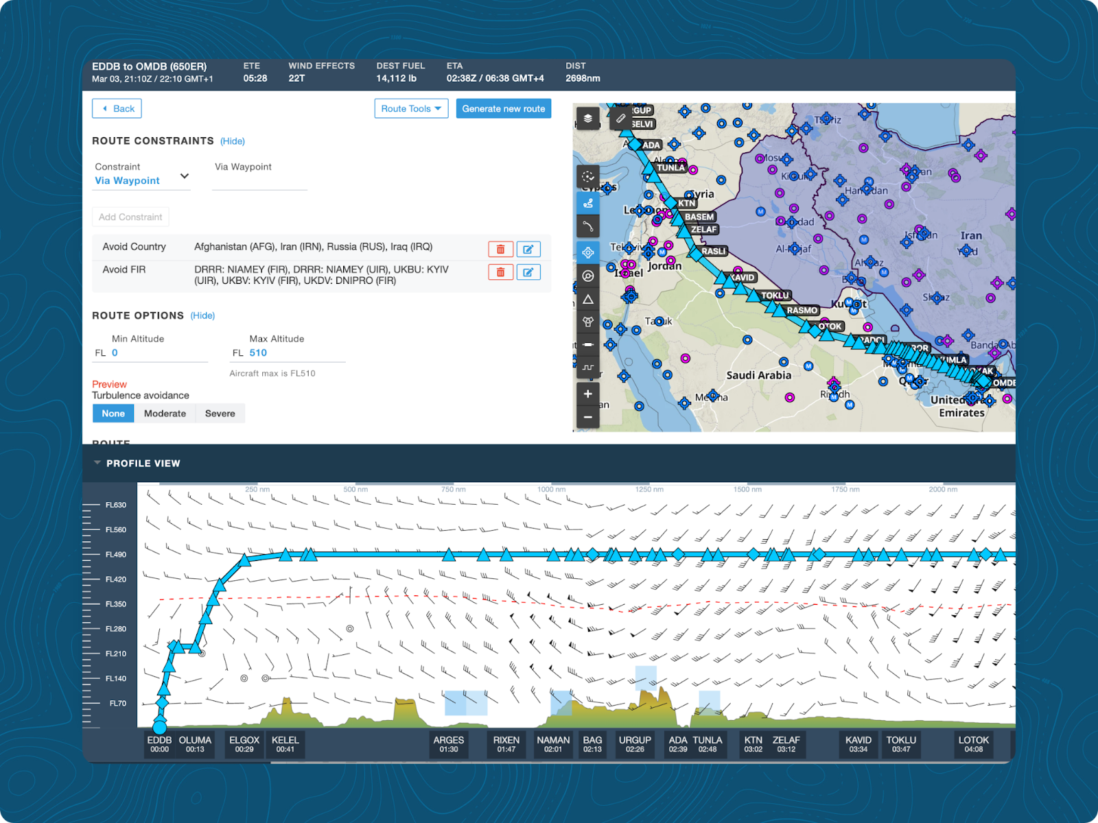 Airspace is getting more complex, and generic routing options rarely suffice. Routes need to be flexible enough to navigate around geopolitical hotspots, airspace closures, and weather while maintaining efficiency. With Route Builder, flight planners have granular control over every segment of the flight path.