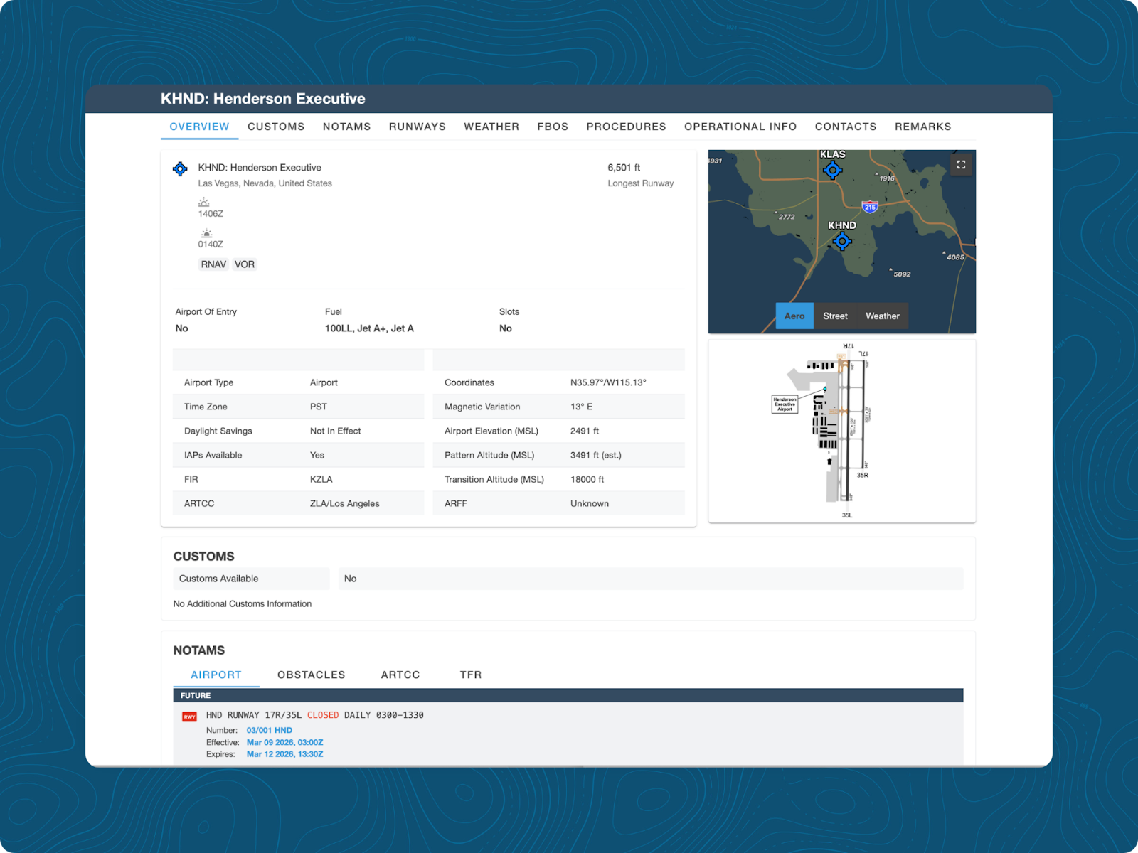 The Airport tab in Dispatch pulls NOTAMs, runway data, procedures, FBO contacts, and other operational details into a single, organized view for any airport worldwide. Recently viewed airports appear at the top, so frequent destinations are just one click away.
