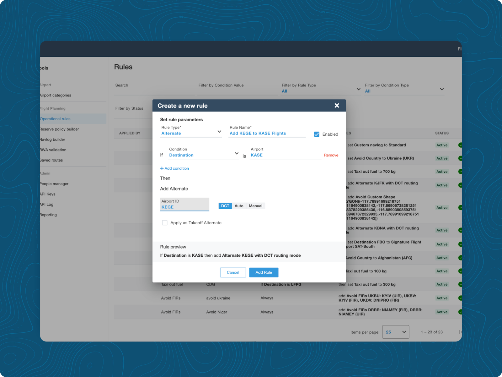 A flight department has a policy that requires a specific alternate airport for flights landing at Aspen/Pitkin County Airport (KASE). The rule is documented in the SOPs and configured in Dispatch. When the planner builds the trip to KASE, Dispatch automatically adds Eagle County Regional (KEGE) as the preselected alternate. The planner verifies that there are no NOTAMs that would prevent landing at KEGE and continues building the flight plan.