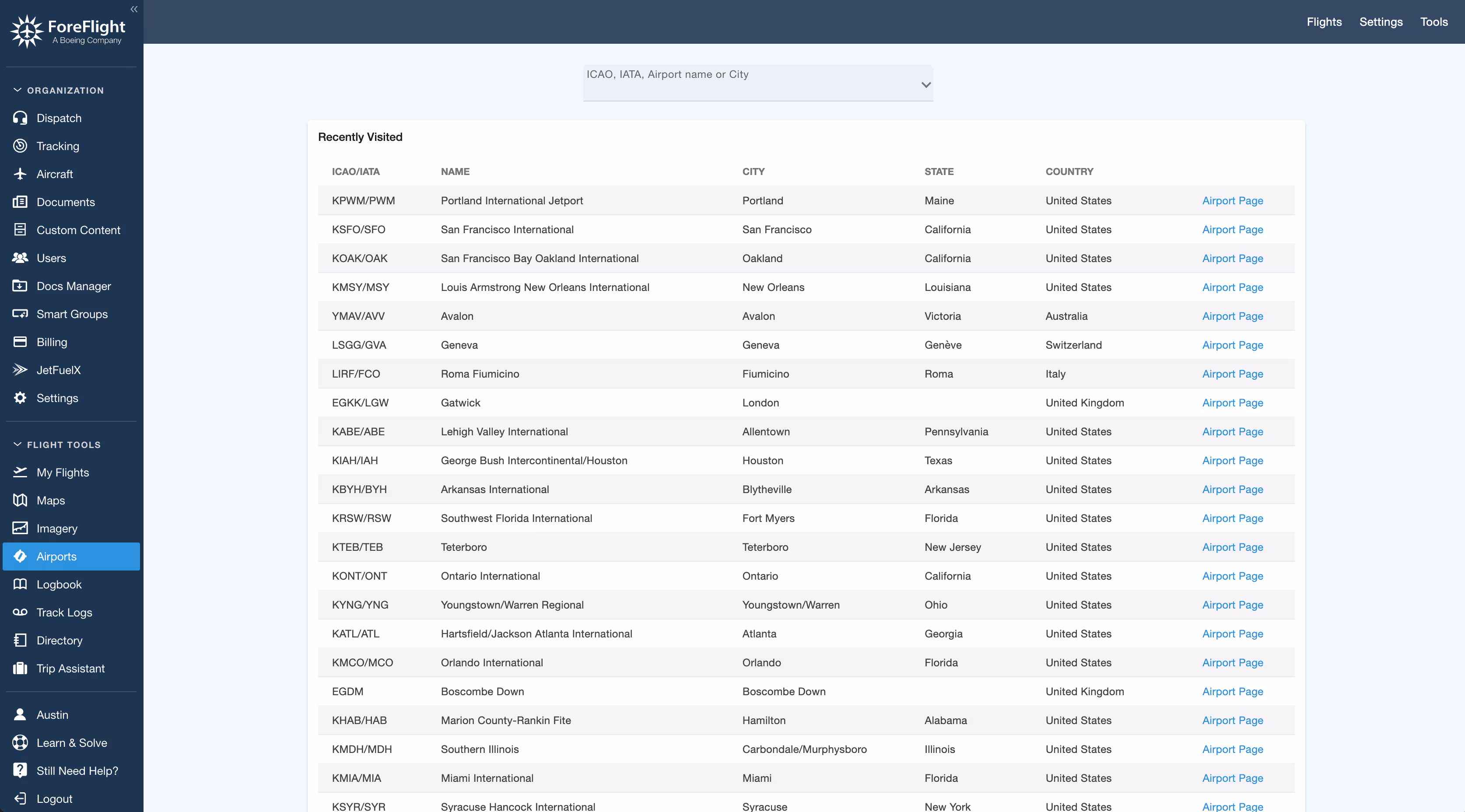 The airport menu option provides a powerful search interface for planners to access airport information quickly. Users can search for airports using various criteria such as name, code, city, or country, retrieving comprehensive details about each location. The tab also displays the 25 most recently viewed airports, creating an efficient navigation experience for frequently searched locations. This feature reduces search time and cognitive load by offering instant access to destination information, making it particularly valuable for flight planners. By combining intuitive search capabilities with a dynamic recent destinations list, the airport menu option streamlines the process of gathering and referencing critical airport-related information.