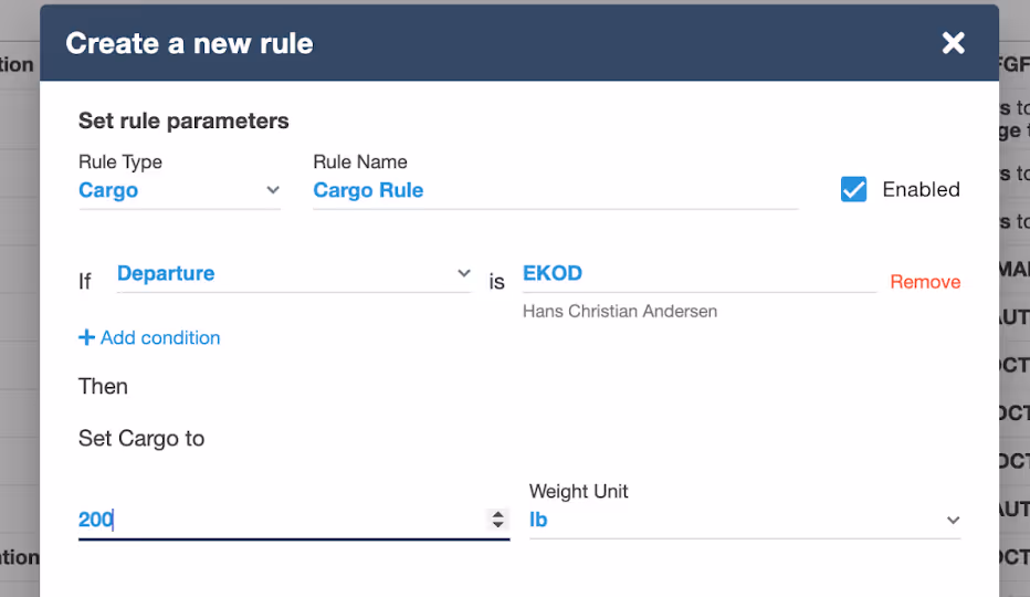 A new operational rule titled “Cargo” will be added, enabling users to set the Cargo value of a flight given a specific condition. To access this new rule, you will navigate to Tools > Operational Rules > select the “Add Rule” button. Under the “Rule Type” drop-down, search and select “Cargo”. Name your new cargo rule and specify the parameters, and save by selecting “Add Rule”.