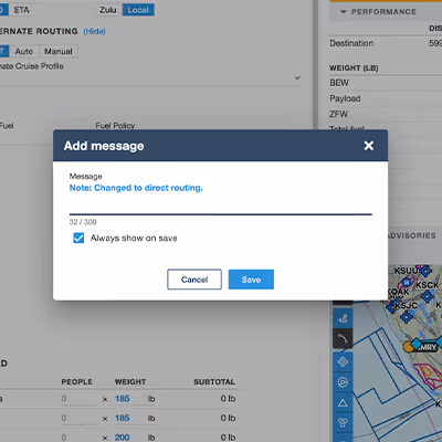 Effortlessly add notes to the Navlog while planning a flight.