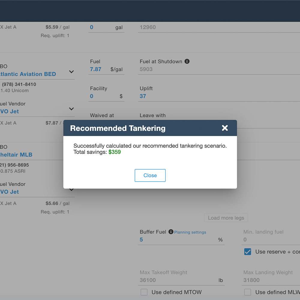 Understand the full picture. Fuel Advisor analyzes uplift location, weight implications, and performance limits to show you the true cost of each fueling strategy and guide decisions with confidence. Contract Jet-A rates, airport and FBO fees, and aircraft performance metrics combine into a single intelligent workflow. No more spreadsheets, no more delays.